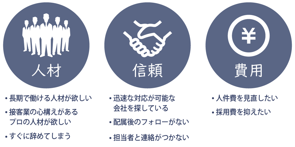 「一刻も早く優秀な人材が欲しい」にお応えします。独自の人選システムを駆使することで、業界最多の登録スタッフの中から短時間で最適な人材を選出します。 「今すぐ人材を」という即日性の高い派遣ニーズに対応すべく、スピードサービスをご提供しています。